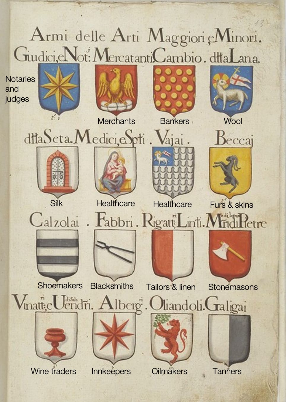 The power—and money—of the commune was concentrated in the hands of these guilds, and of course legislation favored them. Imagine what that did to the competition: Across most of Europe, industrialists, bankers, and merchants had to withstand the logic of Church and nobles. But Florence could do regulatory arbitrage, optimizing everything to support its trade; another advantage to pull forward.