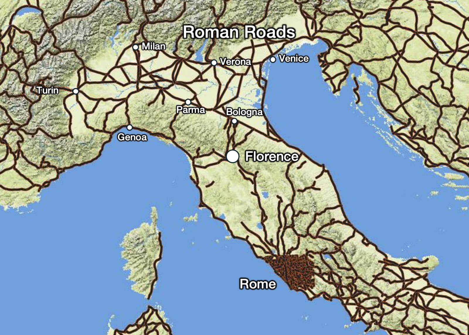 If you wanted to move between the HRE and Rome, the best path went through Florence, which is a natural crossroads because Florence and Bologna flank the Apennine mountains.