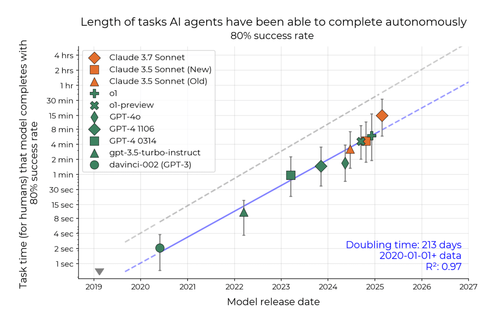 So if you’re keeping the success rate constant, and your task length is doubling every few months, it means the entire line above is moving to the right pretty consistently every few months.