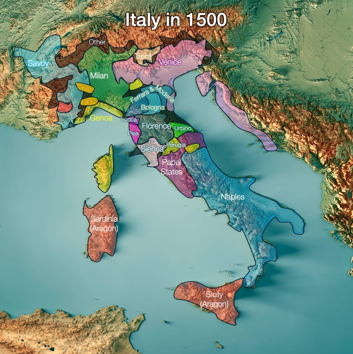 And Italy is very mountainous, with lots of secluded valleys that birthed strong, independent cities. This meant that, in practice, local cities had been quite autonomous for a very long time, even if they were nominatively under the HRE.