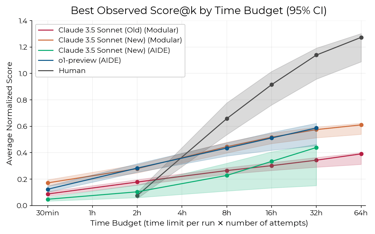 What this graph is telling you is that AIs (in this case, the “very old” Claude 3.5 and o1-preview) beat AI researchers in tasks up to 2-4h, but as AIs and humans are given more time, AI performance increases slowly whereas AI researcher performance goes through the roof. This is why it’s so valuable that AI’s length of tasks keeps improving.