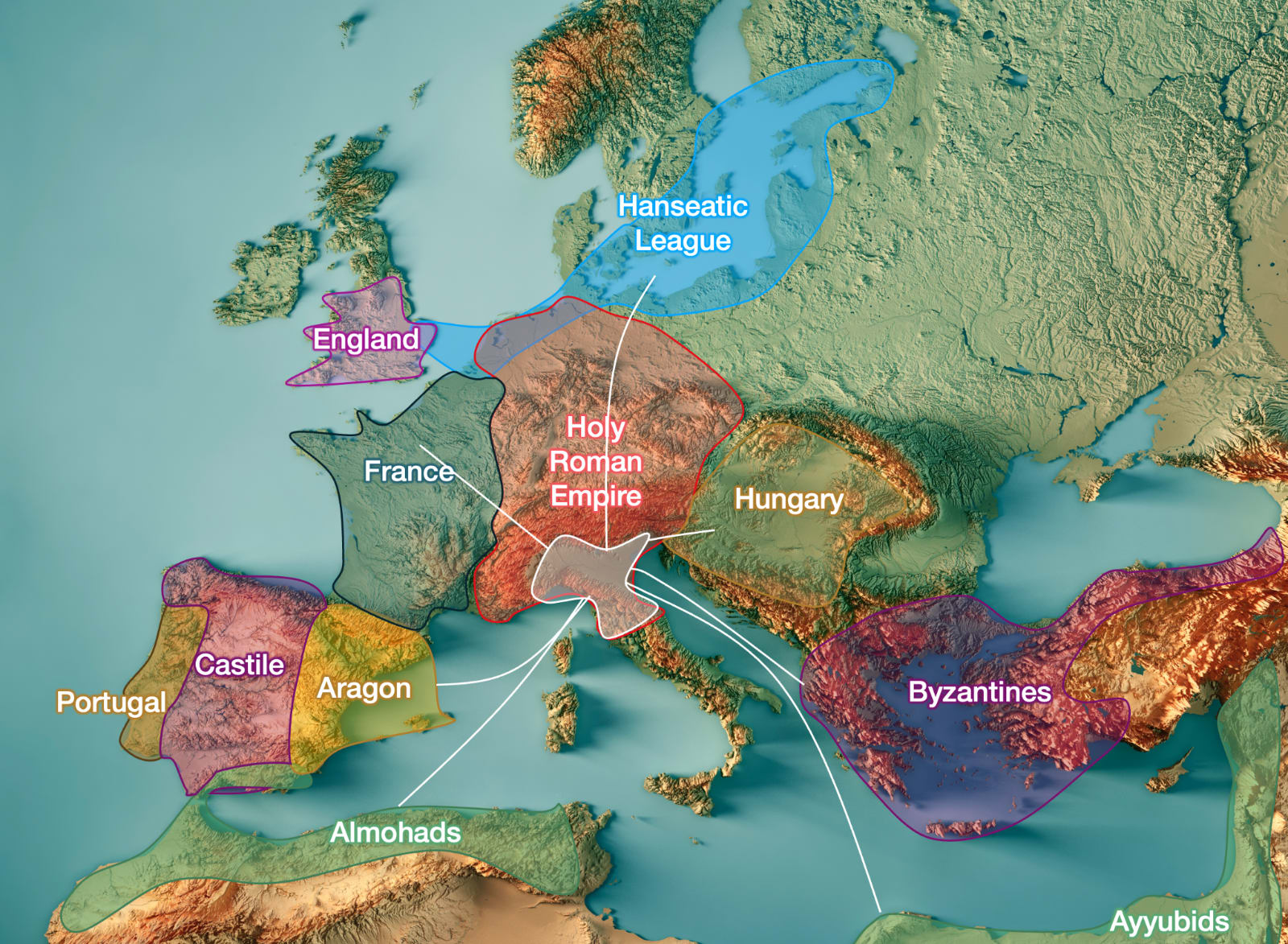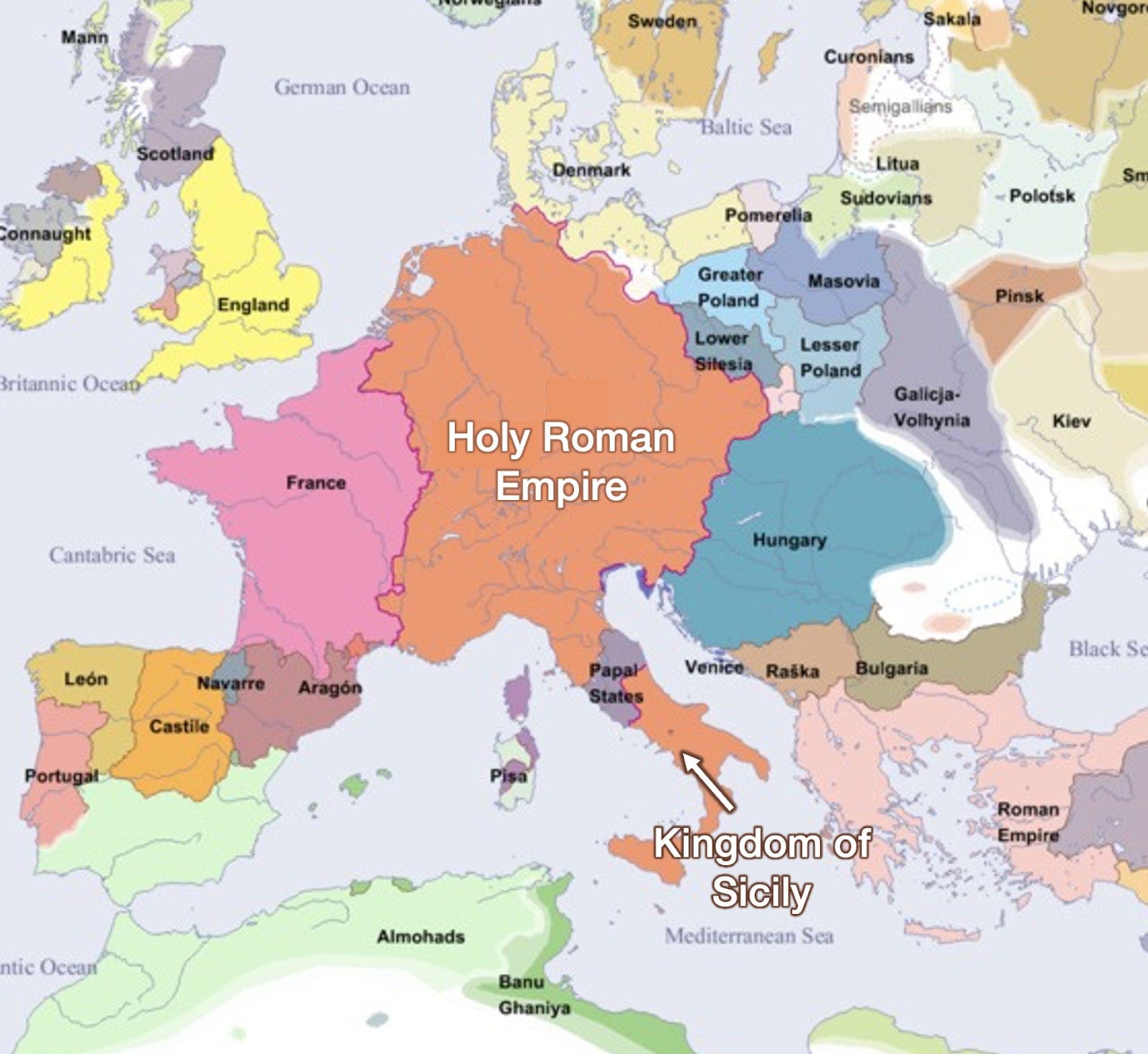 For centuries since the creation of the Holy Roman Empire in the 10th Century, the Emperor and the Pope fought for power and influence, like who would appoint the powerful bishops. Around 1200, the Holy Roman Emperor Frederick II had just united the northern part from his father with the Kingdom of Sicily to the south from his mother. The Pope logically freaked out when he saw his Papal States surrounded, and stirred up revolts everywhere he could in Italy.