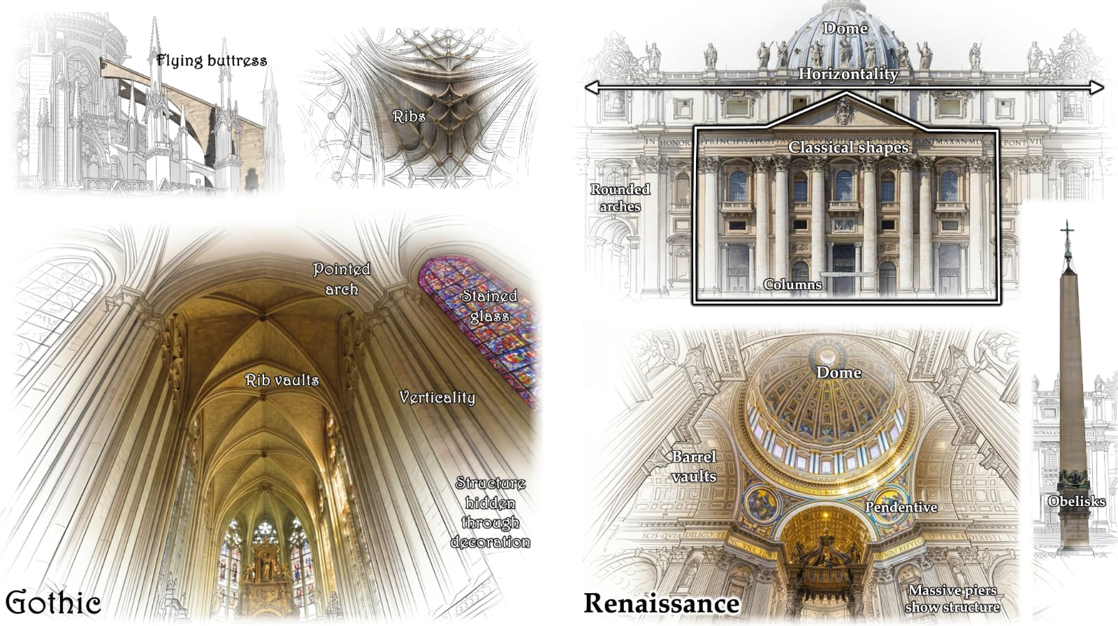 The great thing that Renaissance does is rediscover domes, which are objectively awesome. It also recovered the pendentives (which were Eastern Roman, not from Rome…), and made proportions explicit. But does that mean you have to adopt all the other Roman stuff, too? Why go back to columns and rounded arches, when we’ve seen they’re objectively inferior, since they can only allow smaller spaces? Why go for horizontality, an architectural feeling that was already so pervasive in cities because houses were not tall? Why pretend an obsession with order that your predecessor didn’t have, when in fact Gothic architecture had a similar order that you just couldn’t read?
