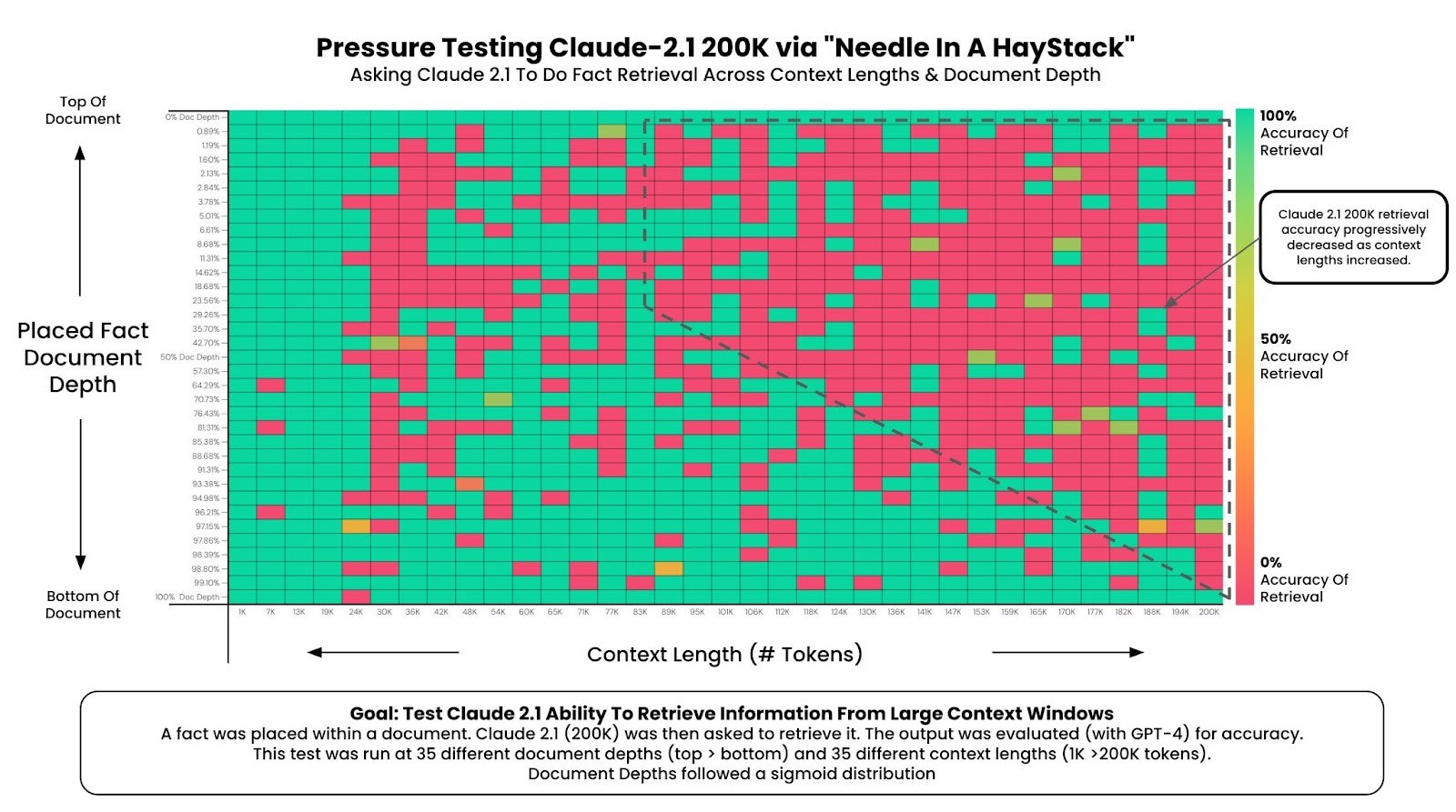 Greg Kamradt was one of the first people to perform a needle-in-a-haystack test on these models. He took a long document and randomly inserted a “needle” sentence like “The best thing to do in San Francisco is eat a sandwich and sit in Dolores Park on a sunny day.”