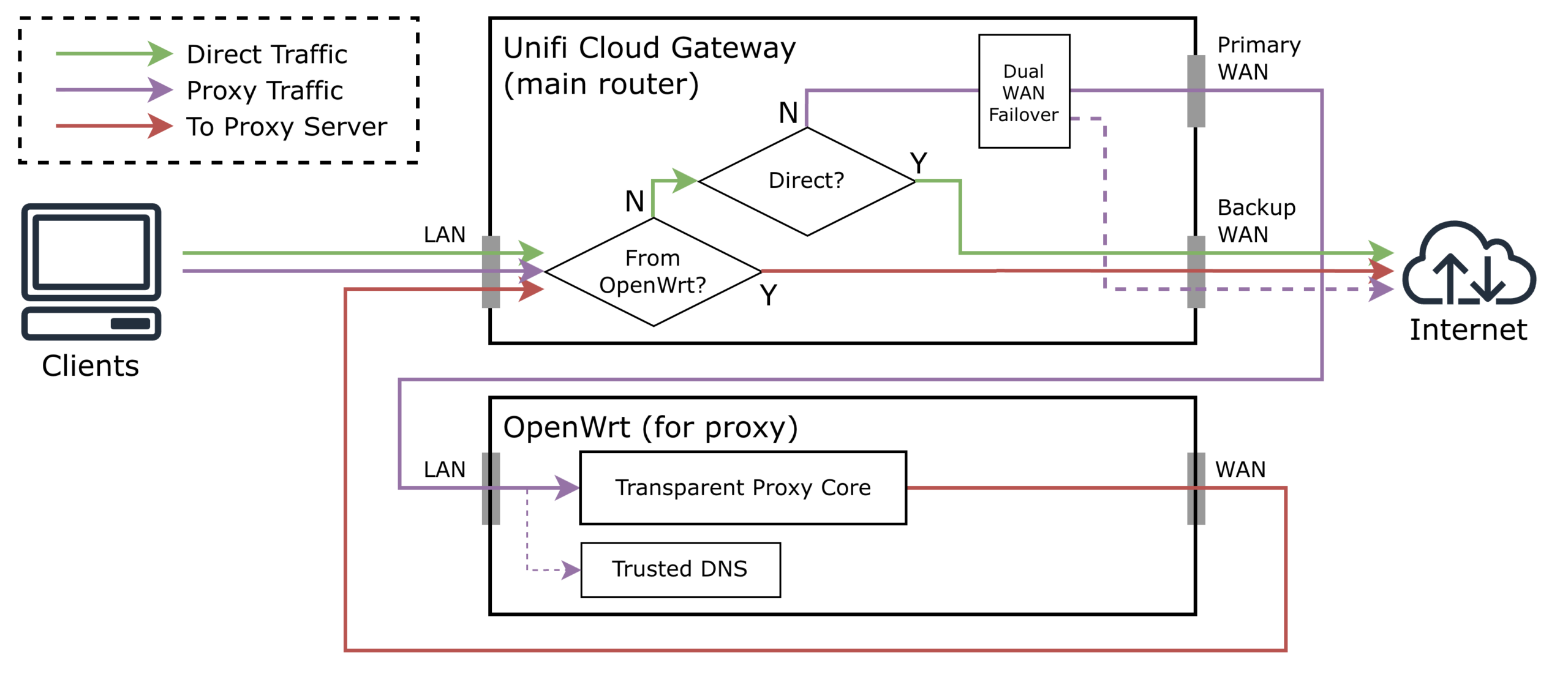 效果:正常情况下,客户端的 DNS 请求先到 Unifi 的 DNS 服务器上(对于 DPI 功能有帮助),然后走 WAN1 -> OpenWrt 的无污染 DNS,解析得到国外地址继续走 OpenWrt 做代理(OpenWrt 再通过 Unifi LAN -> PPPoE 连接代理服务器),国内地址直接走 PPPoE 发出。一旦 OpenWrt 挂掉,Unifi 检测到 WAN1 不通,会自动把全部路由和 DNS 都切换到 PPPoE,实现自动降级直连