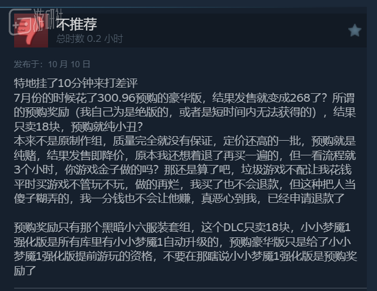 高达178元的标准版定价,游戏流程却仅为3-5小时,再加上豪华版首发降价,成功又惹怒了一批首发预购的核心粉丝。