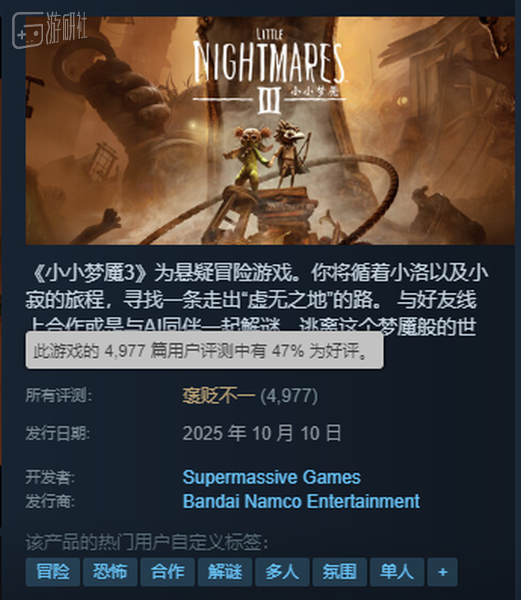 在游戏一代和二代在Steam上均维持90%以上好评率,近50000条评测的良好口碑基础下,该系列的最新作《小小梦魇3》于6天前正式发售,但意想不到的是,目前游戏好评率仅为47%,维持在“褒贬不一”阶段。