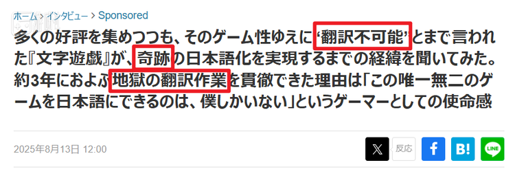 8月份的时候,日本游戏媒体《電ファミ》刊载了一篇关于《文字游戏》的日语本地化采访文章。在标题处,他们直接用上了“不可能翻译”“奇迹”等字样。