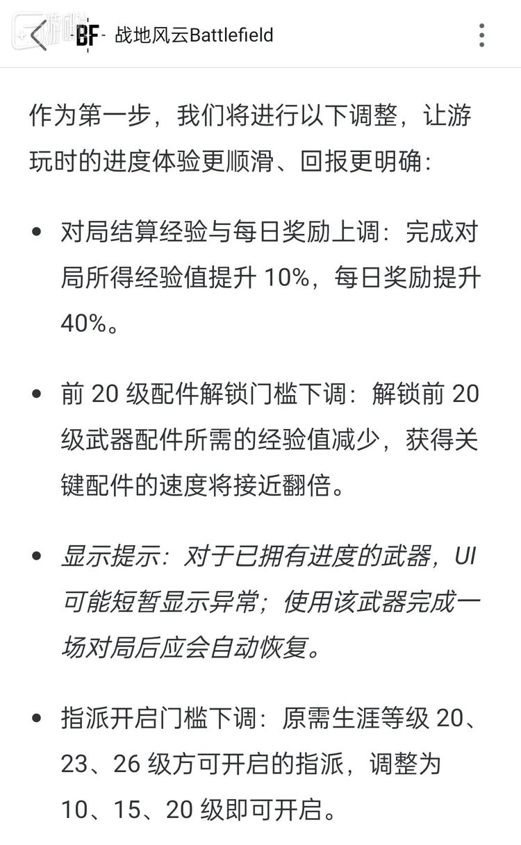 虽说这次《战地6》官方有意树立最基本的“听劝”人设,自内测阶段就经常根据社区反馈对游戏做出修复和调整。官方在我写这篇夜谈的时候实装了初步改进,上调帐户和枪械的经验值获取效率,并承诺会在将来优化任务的挑战条件。