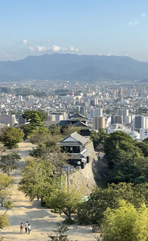 几乎去每个地方都要去古城,大阪城、熊本城,这回来到了松本城。不一样的是,松本城似乎更为古老,楼梯几乎是 90°,年轻人也需要战战巍巍扶着把手一层一层的上楼。非常古老又健壮的城池啊(?为什么是健壮),爬上三楼后,整座城市一览无余,东南西北边友好的标记出下方密密麻麻里较为著名的建筑,如爱媛大学(我只记得这个了)等。