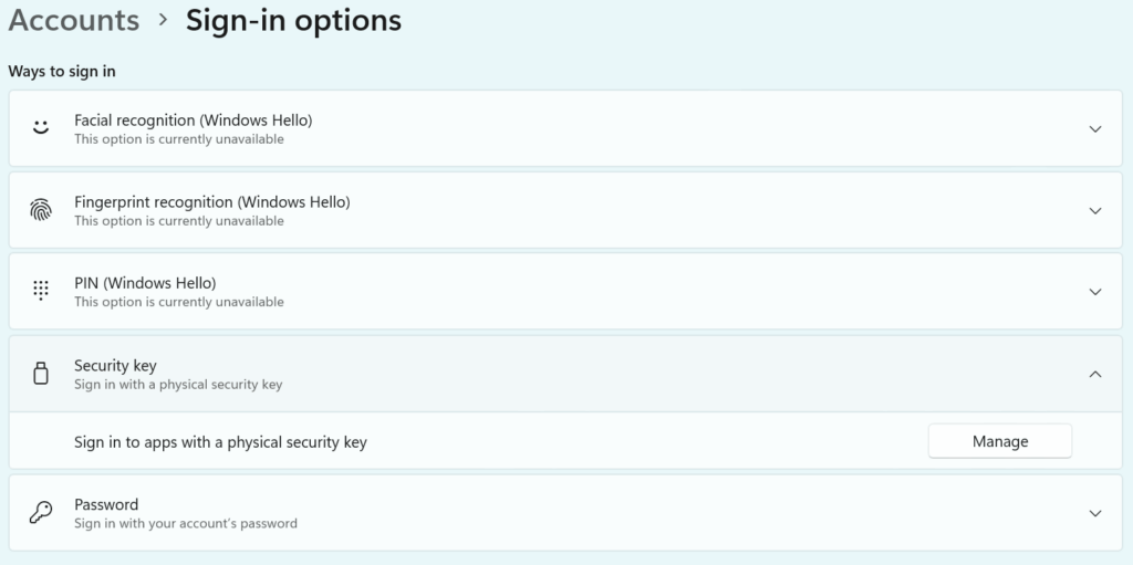 注:如果没有“Security Key”这个选项,可以添加两个Windows注册表项,然后再将其与YubiKey 捆绑在一起。在注册表中添加以下两个项:HKEY_LOCAL_MACHINE \ Software \ Microsoft \ Windows \ CurrentVersion \ Authentication \ Credentials \ Provider \ {8bf9a910-a8ff-11d2-93e0-00c04f72dfcd}和HKEY_LOCAL_MACHINE \ SOFTWARE \ Microsoft \ Windows \ CurrentVersion \ Authentication \ Credential Providers \ {8bf9a910-a8ff-11d2-93e0-00c04f72dfcd}。这将允许Windows使用YubiKey 作为登录方式。
