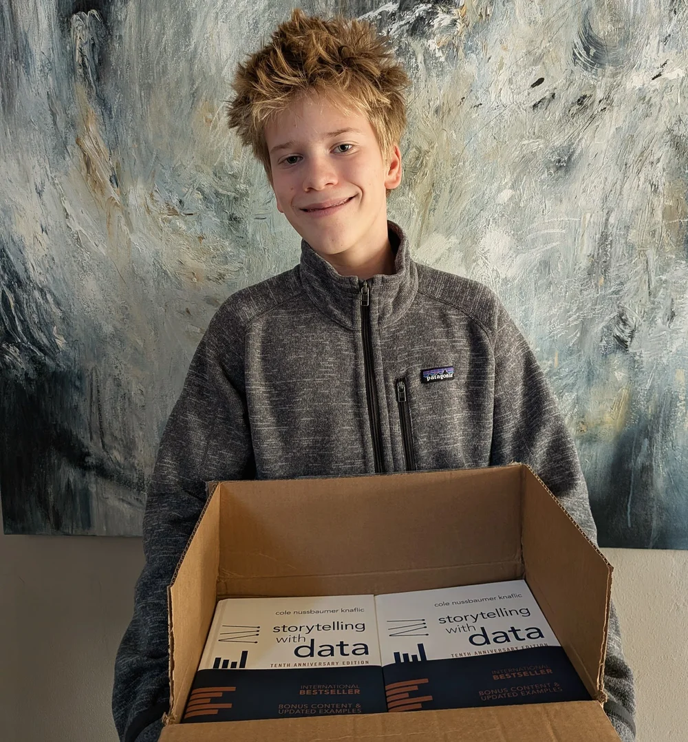 As I’ve reflected on this milestone, I’ve found myself revisiting old photos. The one at the top of this post reminded me of another that made me smile—and filled me with awe at the passage of time. Ten years ago, my oldest son, Avery, played in the box that delivered my first copies of storytelling with data. This weekend, almost-13-year-old Avery helped me move boxes of the 10th anniversary edition.